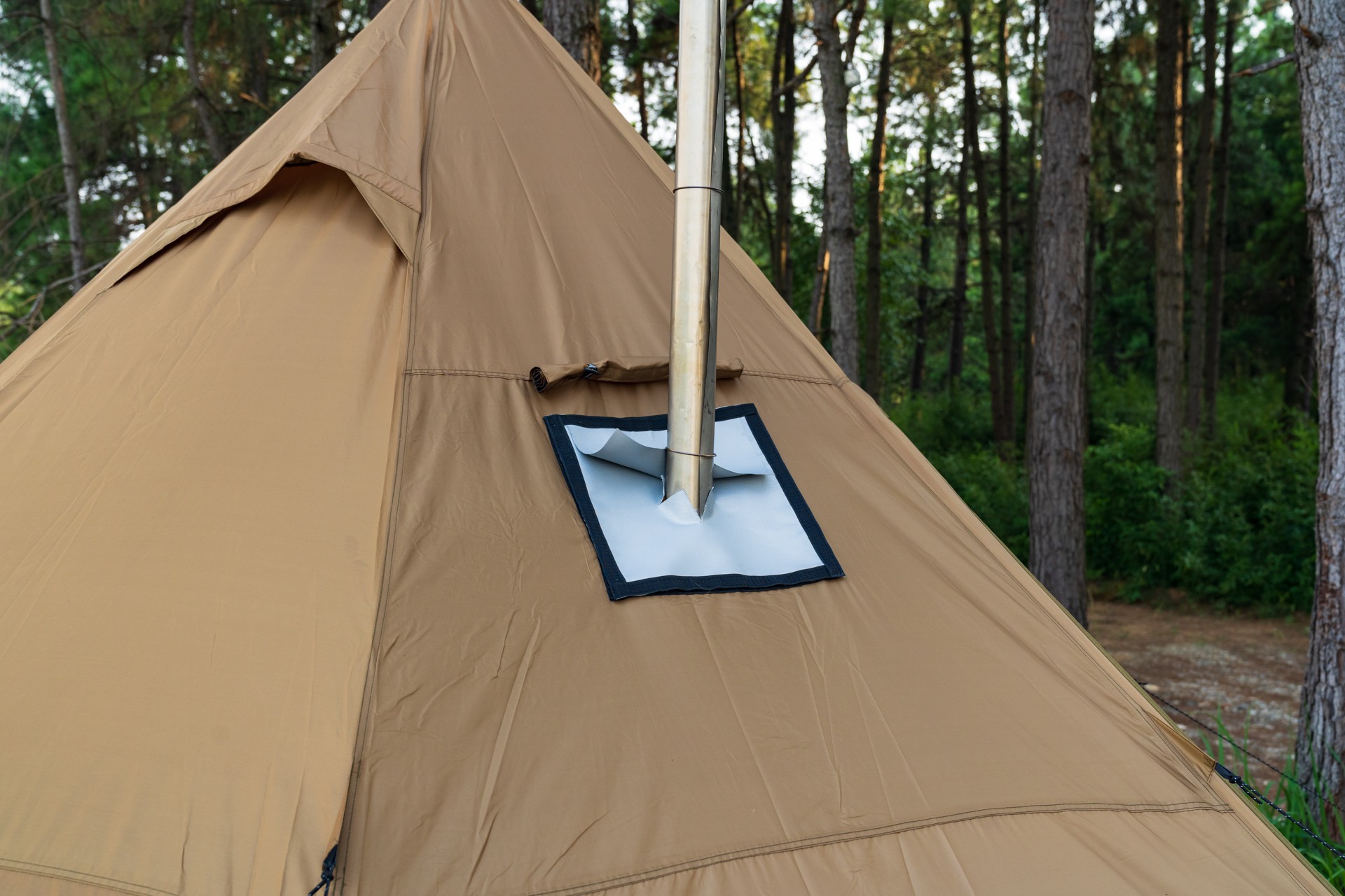 Stove jacks, or flashings, are heat-safe exit points that allow the flue pipe of a tent stove to extend through the roof or sidewall of a tent. Smoke from the camp stove can safely escape through the flue pipe while the stove jack keeps heat inside your tent - and rain and snow outside. FireHiking hot tents are equipped with fire-proof cloth, which is resistant to high temperature and can effectively prevent the furnace tube from burning the tent.